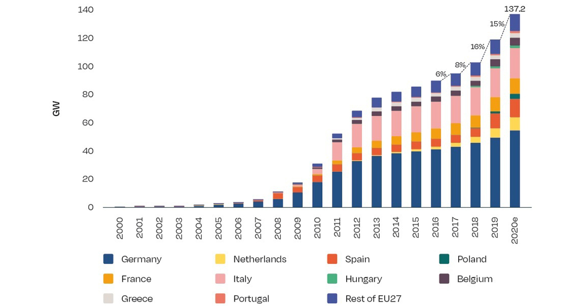 Onderstaande figuur bevat het cumulatief geïnstalleerde vermogen in Europa dat in 2020 is gegroeid tot 137,2 gigawattpiek. In heel Europa werden sinds 2011 niet meer zo veel zonnepanelen geïnstalleerd als dit kalenderjaar: 18,7 gigawattpiek. De verkopen groeiden ondanks de coronacrisis met 11 procent.